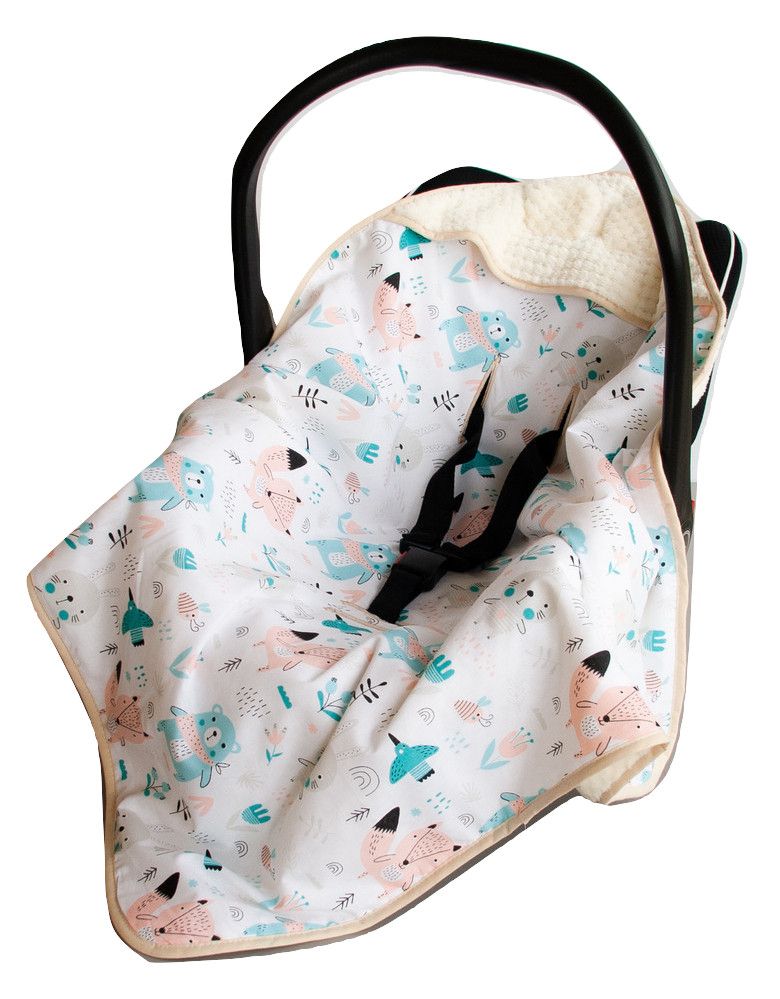 Apraksts Autosēdeklīša guļammaiss "Forest" 80x80 cm bēšs ar baltu kokvilnu ar meža dzīvniekiem (piparmētra krāsā)