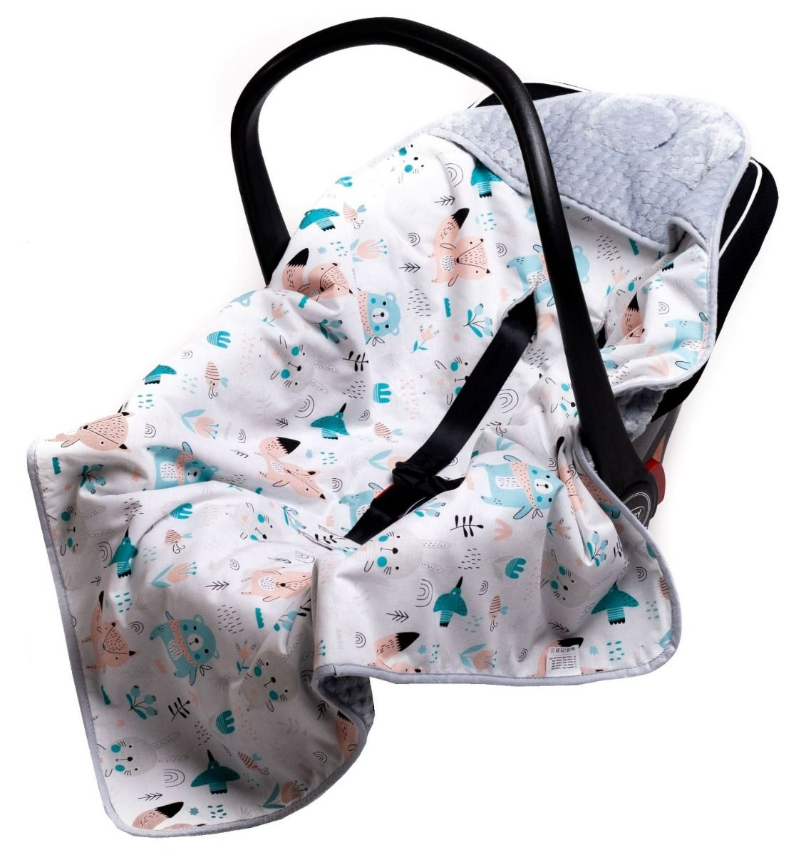 Apraksts Autosēdeklīša guļammaiss "Forest" 80x80 cm pelēks ar baltu kokvilnu ar meža dzīvniekiem (zilā krāsā)