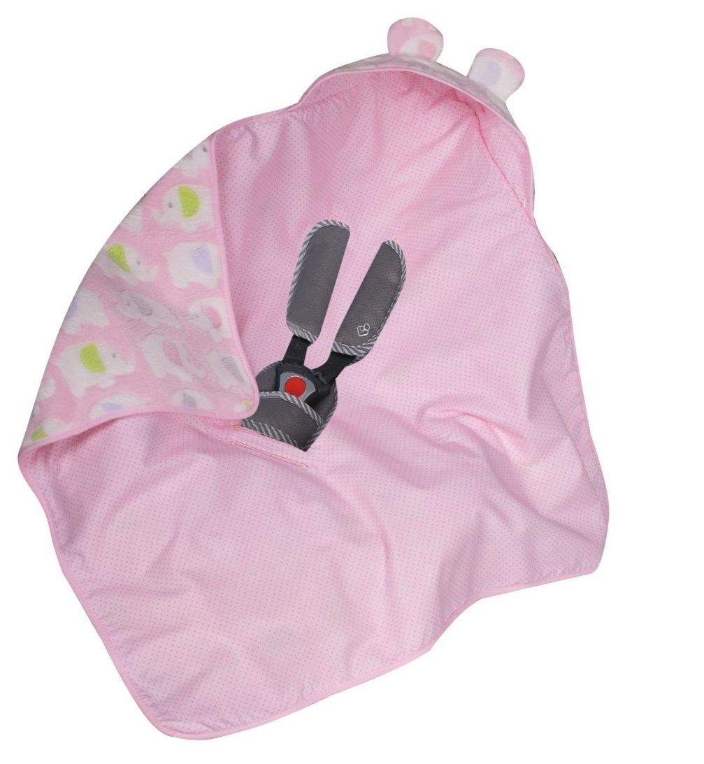 Apraksts Autokrēsliņa guļammaiss "Elephants & Dots" 80x80 cm rozā rozā plīša ar ziloņiem, otrā pusē rozā kokvilna ar punktiem