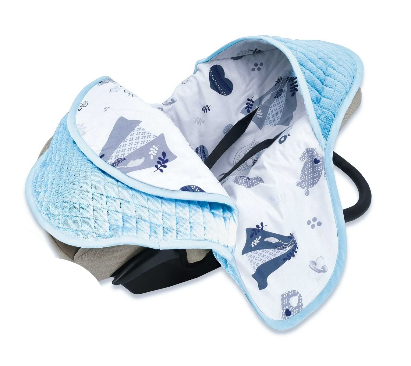 Одеяло для автокресла совместимо с большинством автомобильных сидений, подходит для сидений 0-13 кг с 3-точечными ремнями безопасности.