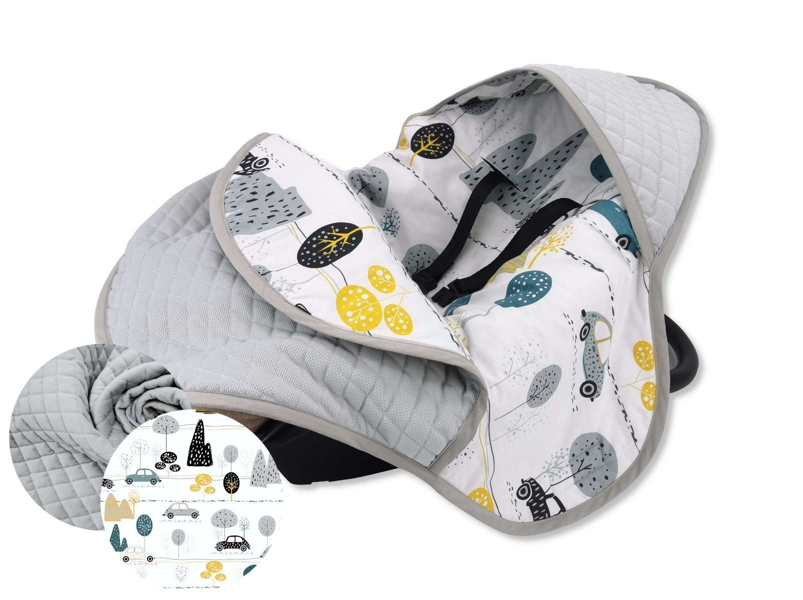 Одеяло для автокресла совместимо с большинством автомобильных сидений, подходит для сидений 0-13 кг с 3-точечными ремнями безопасности.