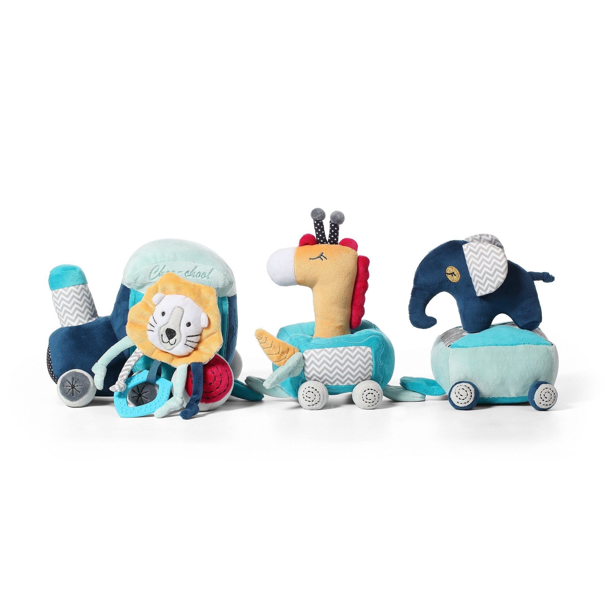 Edukacinių žaislų rinkinys SAFARI TRAIN susideda iš lokomotyvo su dviem vagonais ir prie jų pritvirtintų girgždančių, barškančių ir šiugždančių mielų žaislų.