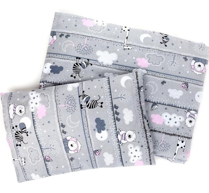 Bērnu gultas veļa šūpulim 80x70cm "Safari" pelēks ar rozā zebra un lācis
