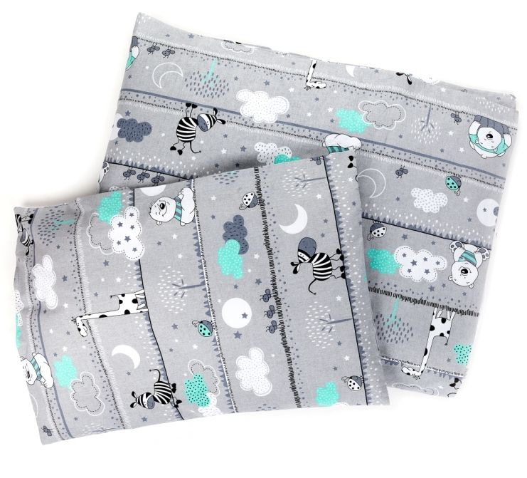 Bērnu gultas veļa šūpulim 80x70cm "Safari" pelēks ar tirkīzs zebra un lācis