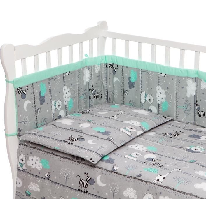 Apraksts Bērnu gultas veļa ar apmales "Safari" pelēks ar tirkīza zebra un lācis