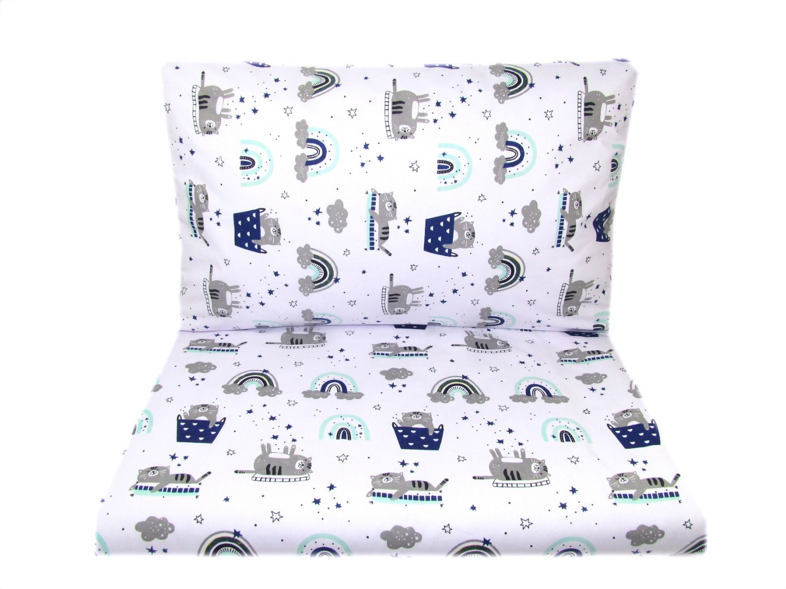 Apraksts Bērnu gultas veļa 135x100 "Grey" ar kaķēniem un zilām detaļām.