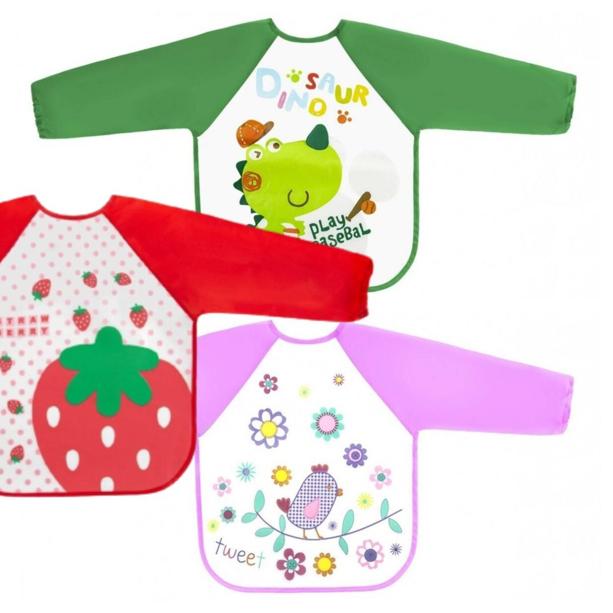 Слюнявчик с длинными рукавами изготовлен из легкого, мягкого и легко чистящегося материала. Есть специальный карман, который предотвращает падение крупных кусков пищи.