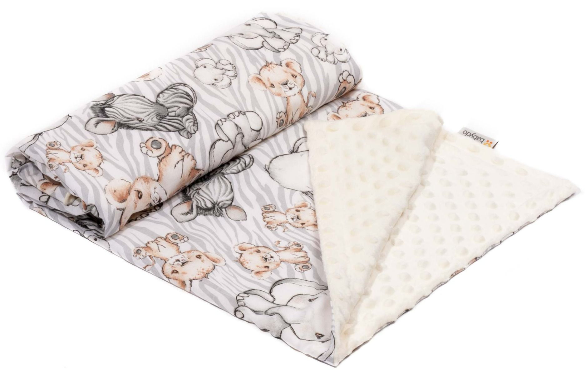 Mīksts, silts, pūciņas viegluma plediņš mazulim. Var izmantot kā sedziņu vai kā ērtu, kompaktu plediņu. Plediņš no vienas puses ir kokvilnas, no otras puses īpaši mīksts, pieskārienam patīkams plīša audums.
