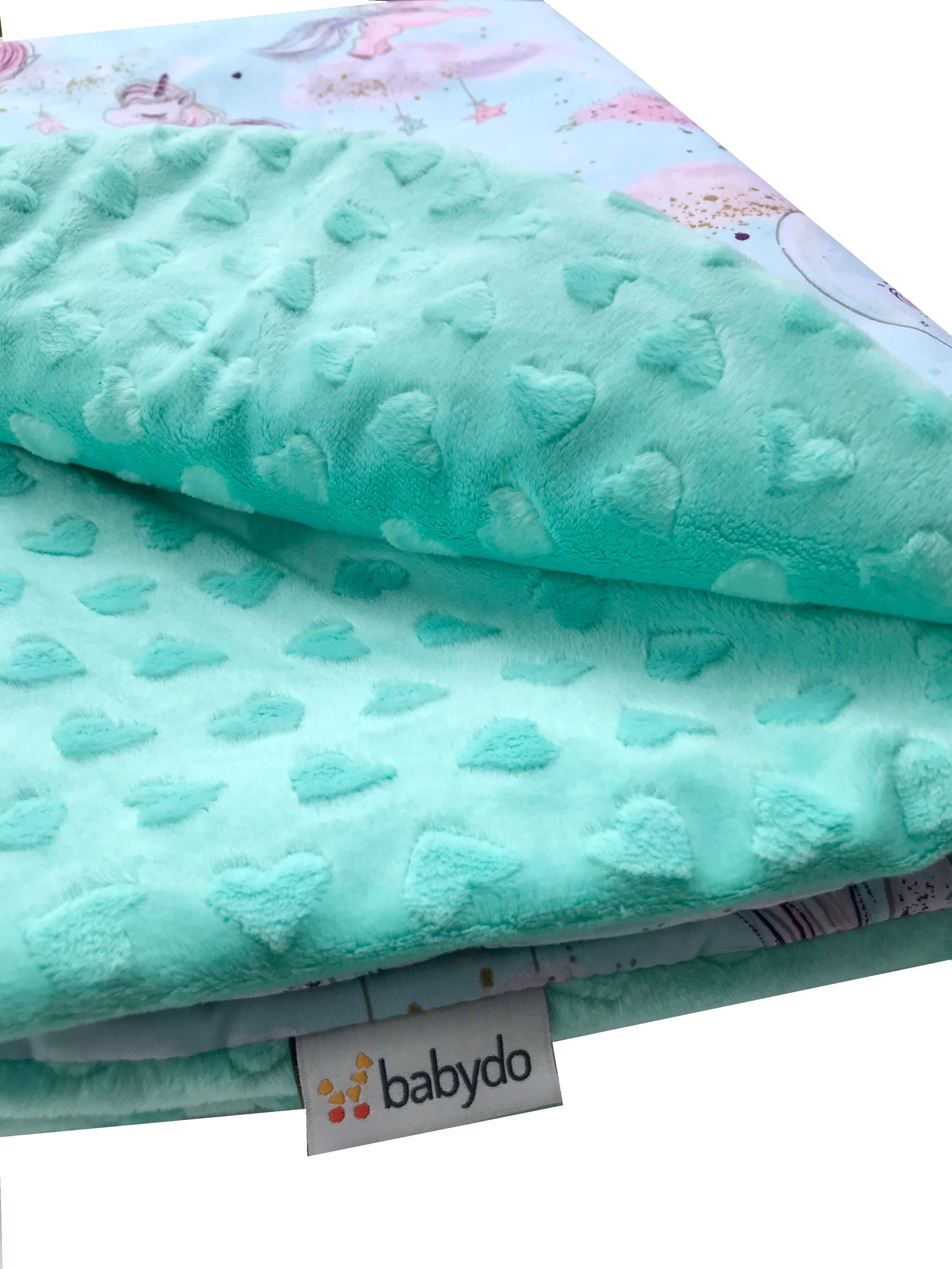 Komplekts ratiņiem spilvens un sega "Unicorn" ar tirkīza sirdīm