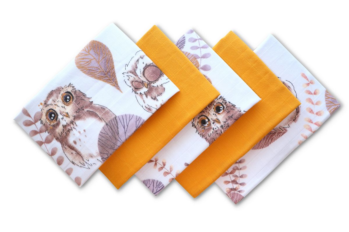 Muslīna mini autiņi komplekts "Mini" 5 gab. 38x38 cm Owls yellow