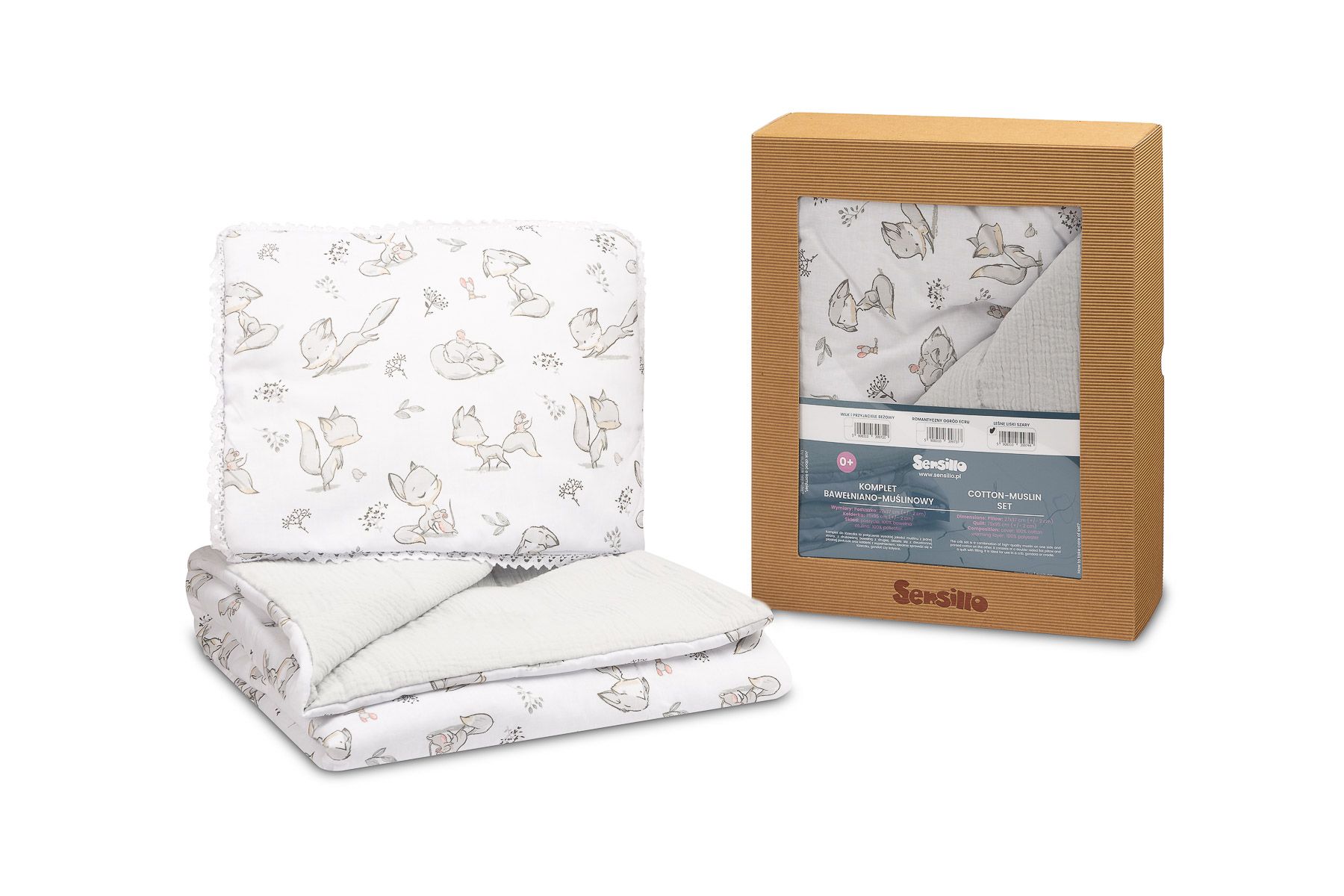 Apraksts Muslīna un kokvilnas pleds un spilvens zīdainim "Foxy" pelēks