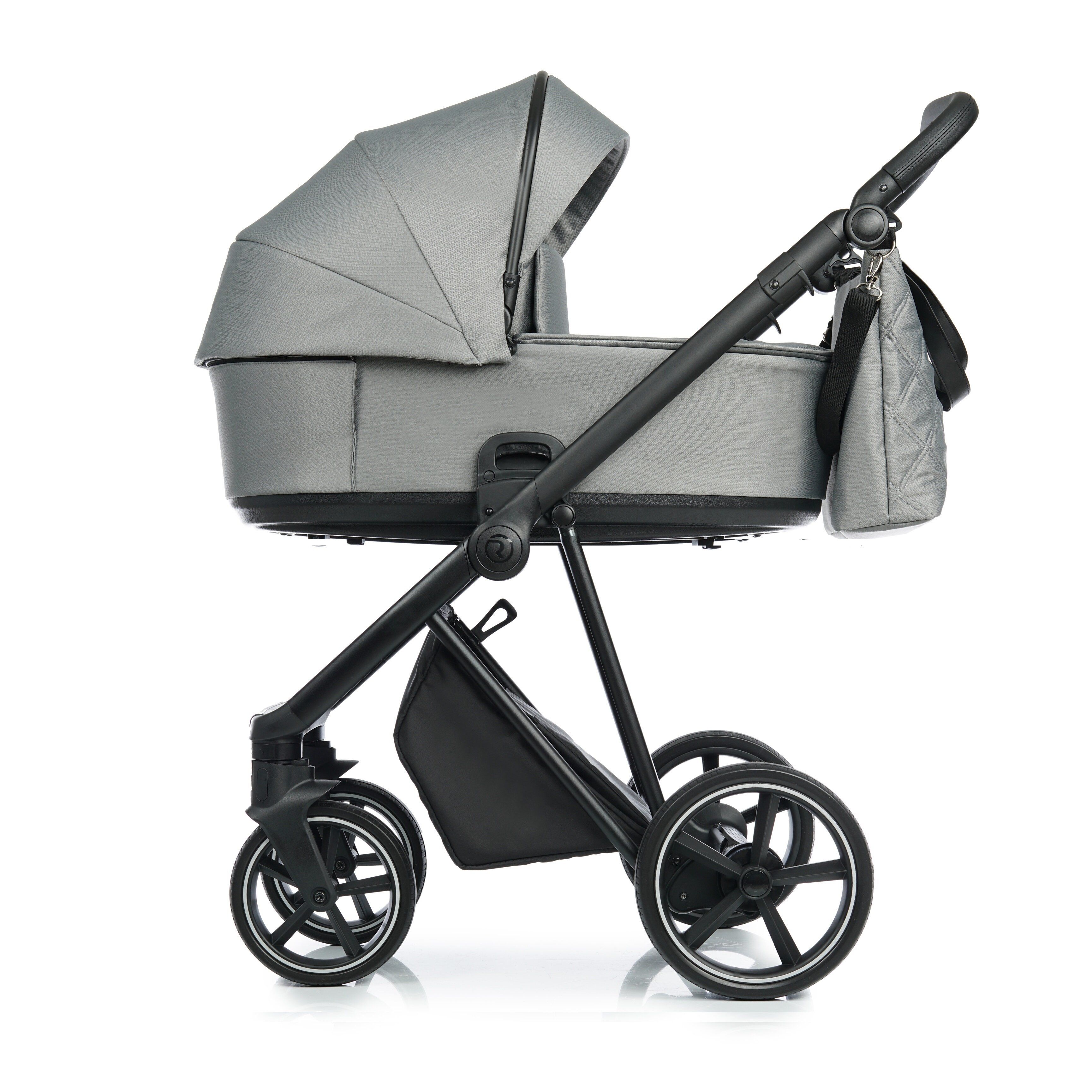 Reguliuojama rankena apsiūta EKO oda. Lengva ir patogi „Click“ sistema, skirta montuoti lopšį, vežimėlį ir auto-kėdutę.