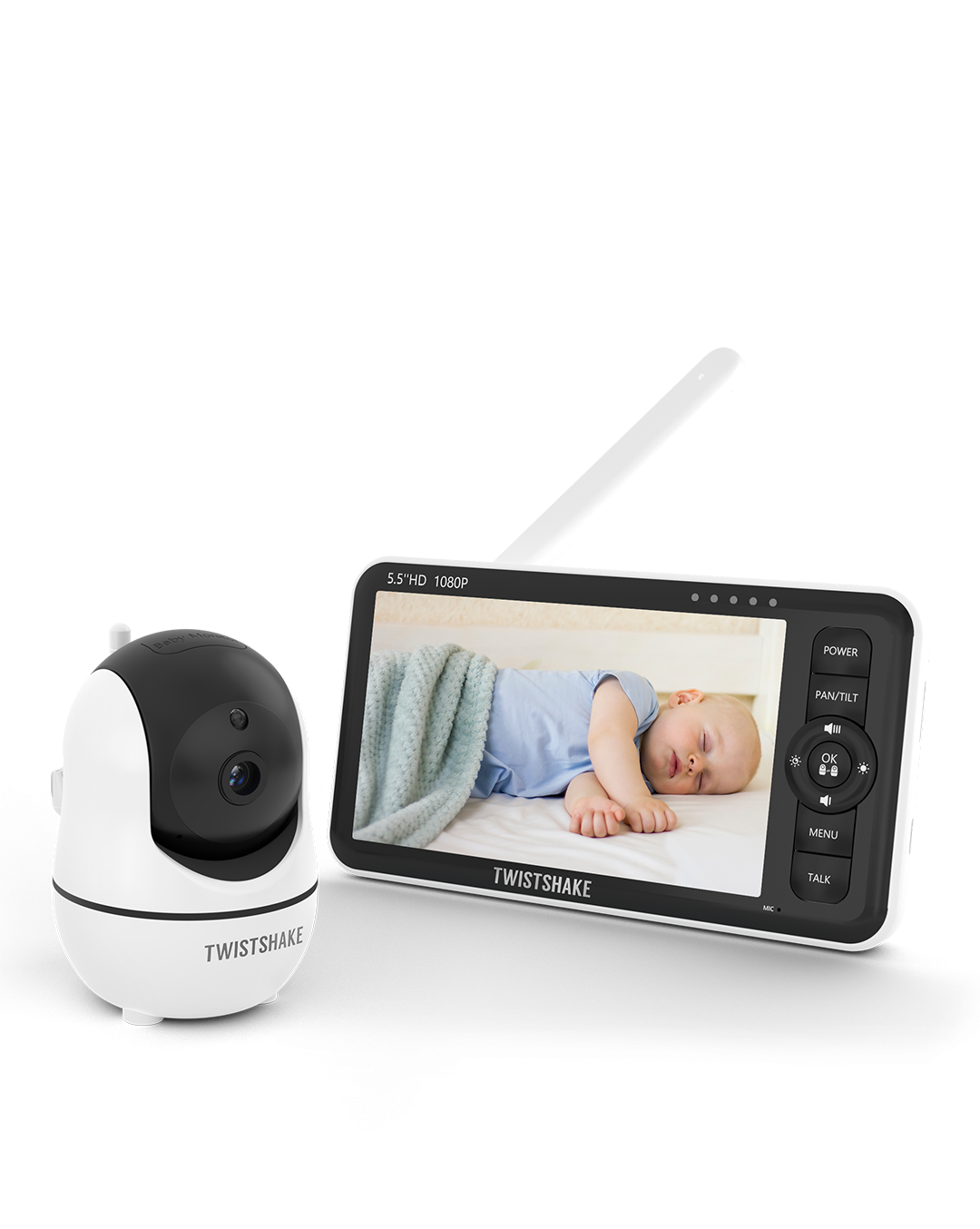 Naudodami pažangią TWISTSHAKE kūdikio stebėjimo sistemą, visada galėsite matyti savo kūdikį. Full HD 1080p vaizdas 5,5 colio ekrane ir 3 MP kamera su 360° pasukimu užtikrina aiškų ir detalų stebėjimą.