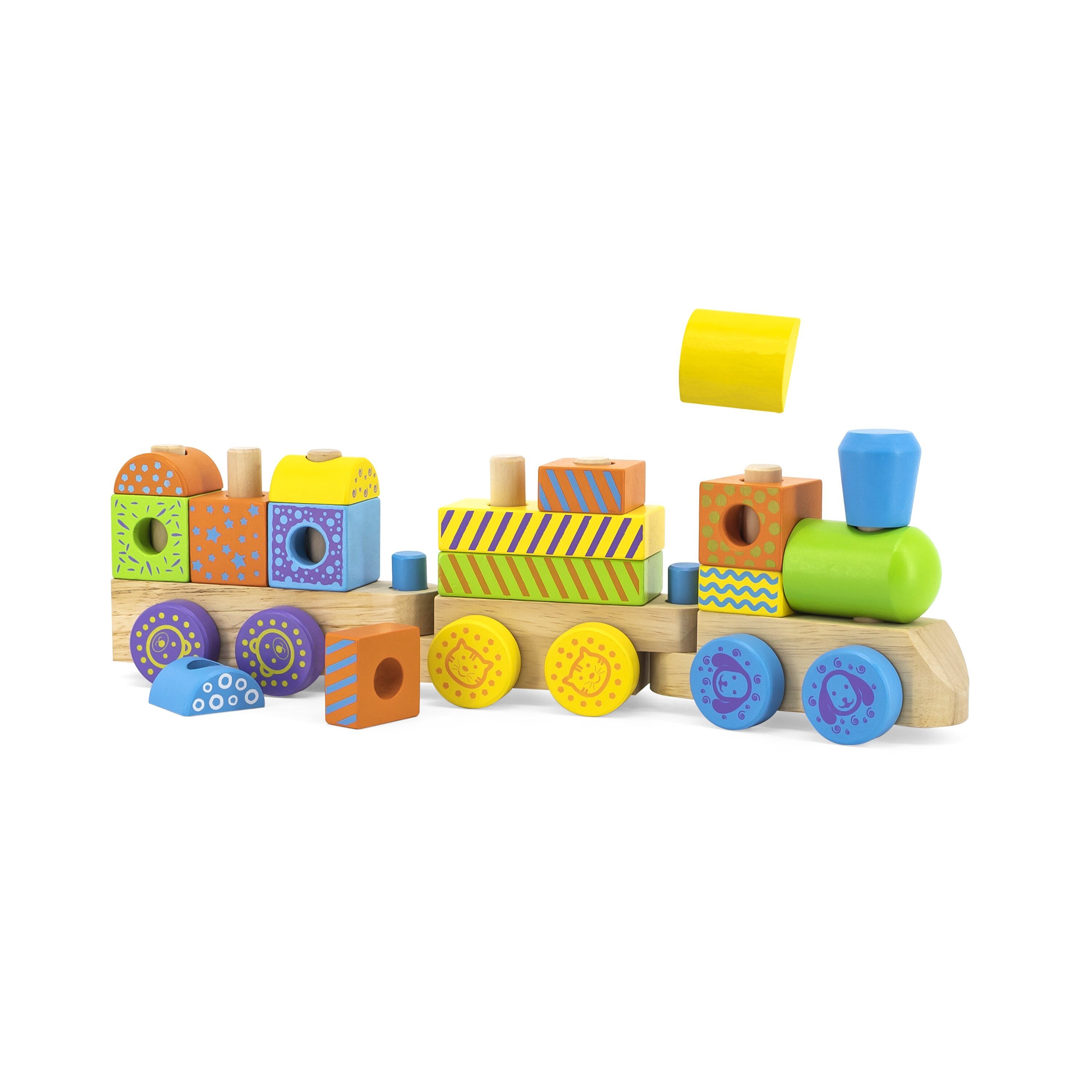 - 14 lengvai suimamų medinių kaladėlių pritvirtinamos ant vagonų strypelių, o tai suteikia puikią galimybę lavinti vaiko smulkiosios motorikos įgūdžius.