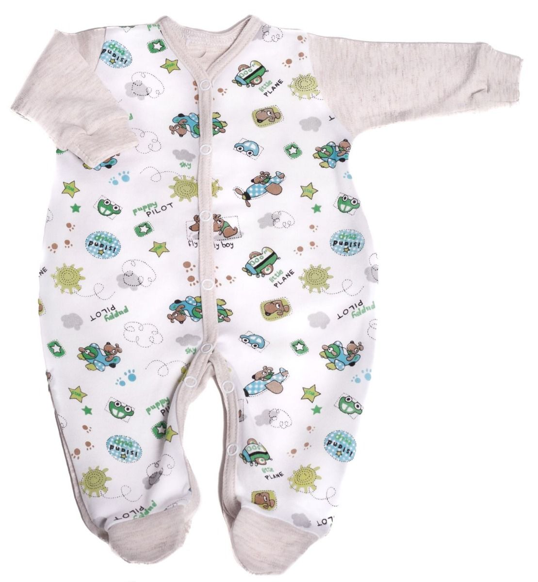 Apraksts Zīdaiņu kokvilnas rāpulītis ar piedurknēm "Pilot" balta kokvilna ar krāsainām lidmašīnām